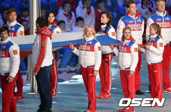 안현수를 비롯한 러시아 금메달 리스트들이 입장하고 있다.