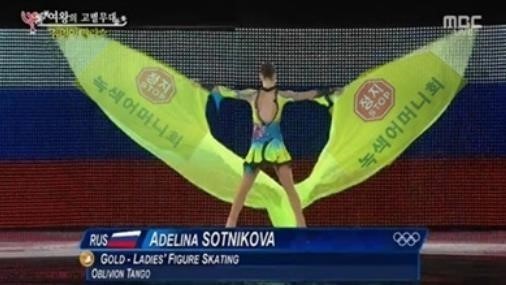 소트니코바는 23일(이하 한국시간) 러시아 소치의 아이스버그 스케이팅 팰리스에서 열린 피겨스케이팅 갈라쇼에 참가, 25번째로 연기를 펼쳤다. 김연아의 프리스케이팅곡 '아디오스 노니노'를 작곡한 아스트로 피아졸라의 명곡 '오블리비언 탱고'에 맞춰 형광색 깃발을 들고 나선 소트니코바는 색다른 갈라쇼 무대를 선보였고, 경기 때와 같이 러시아 관중들의 열렬한 환호를 받았다.