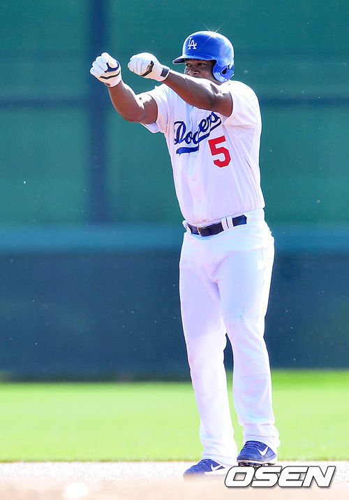 1회초 청팀 류현진에 2루타를 친 백팀 후안 유리베가 세레모니를 하고 있다.