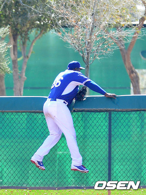 1회초 청팀 야시엘 푸이그가 백팀 디 고든의 홈런 타구를 잡으려 펜스를 올라가고 있다.