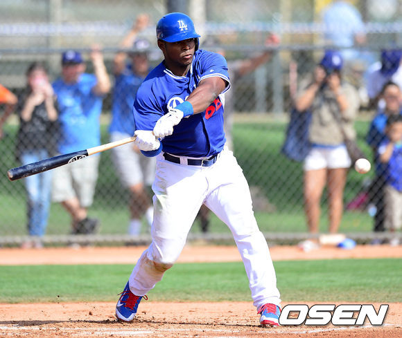 1회말 청팀 야시엘 푸이그가 2루타를 치고 있다.