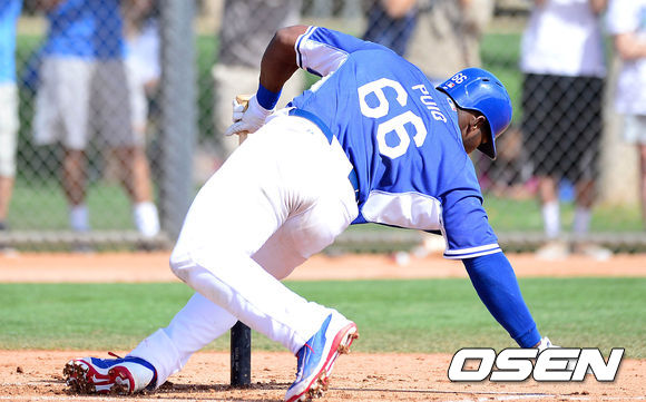 1회말 청팀 야시엘 푸이그가 백팀 맷 매길의 몸쪽 공에 놀라고 있다.