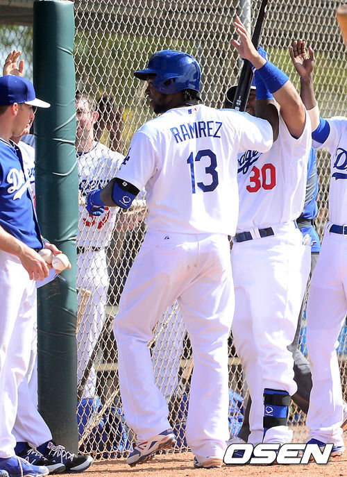 1회초 주자 2루 상황에서 청팀 류현진을 상대로 투런 홈런을 친 백팀 핸리 라미레스가 더그아웃에서 동료들의 축하를 받고 있다.