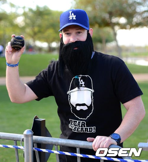 다저스 브라이언 윌슨의 트레이드 마크인 긴 수염 복장을 한 팬이 취재진을 향해 포즈를 취하고 있다.