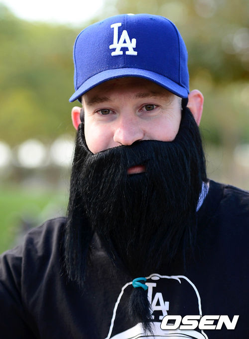 다저스 브라이언 윌슨의 트레이드 마크인 긴 수염 복장을 한 팬이 취재진을 향해 포즈를 취하고 있다.