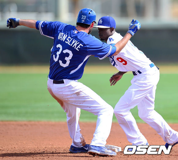 4회말 백팀 디 고든이 안타를 치고 2루로 향하는 청팀 반 슬라이크를 아웃처리하고 있다.