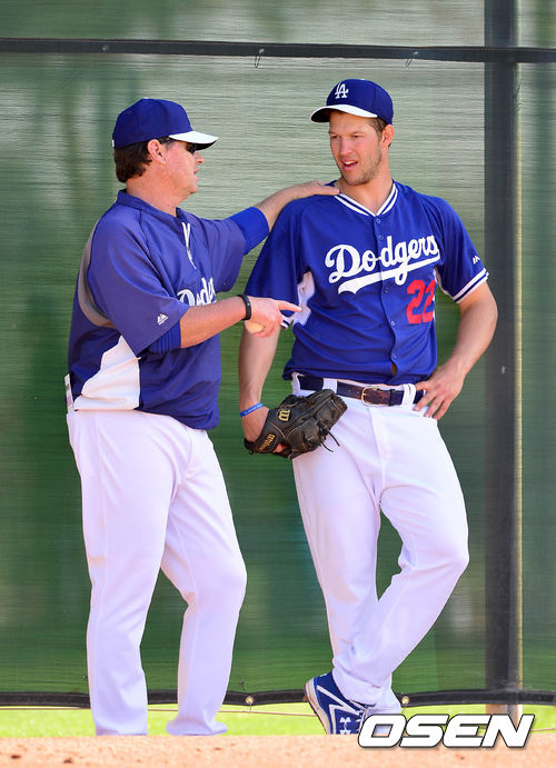 불펜 투구를 마친 다저스 클레이튼 커쇼가 릭 허니컷 투수코치와 이야기를 나누고 있다.