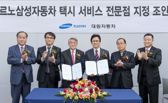 르노삼성자동차가 21일 서울 중랑구에 위치한 대원자동차에서 박동훈 영업본부장 부사장, 국철희 서울개인택시운송사업조합 이사장 등 30여명의 관계자들이 참석한 가운데 택시전용 A/S 전문점 조인식을 가졌다.