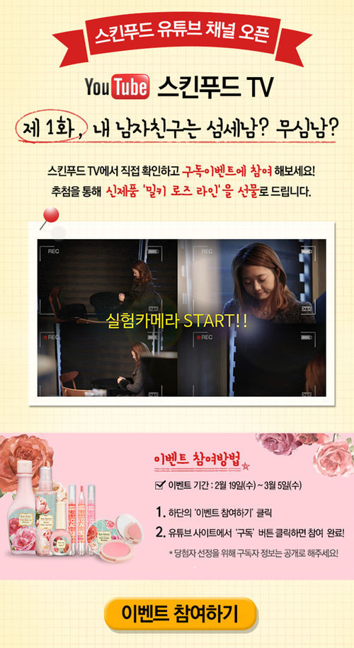 한편 스킨푸드는 이번 유튜브 공식 오픈을 기념해 ‘스킨푸드TV’ 구독하기 이벤트를 진행한다. 3월 5일까지 유튜브 ‘스킨푸드TV(http://www.youtube.com/eskinfood)’채널을 방문, 구독하기 버튼을 누르면 응모가 완료된다. 단, 당첨자 선정을 위해 구독자 정보는 공개 상태여야 한다. 응모자 중 30명을 추첨해 메이크업 신제품 ‘밀키 로즈’ 라인을 선물로 준다. 당첨자는 3월 10일 구글 개인계정으로 발표한다.