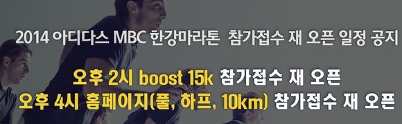 2014 아디다스 MBC 한강 마라톤 대회는 오는 3월30일에 개최되며 원활한 운영을 위해 각 코스별 인원이 제한돼 있다. 참가신청시 각 코스별로 입금자 기준 선착순 마감되다.