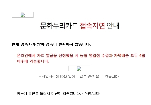또한 문화누리카드는 홈페이지를 통해 온라인 시스템을 점검하고 있으며, 온라인 접수시 4월에나 카드를 수령할 수 있다고 알렸다.