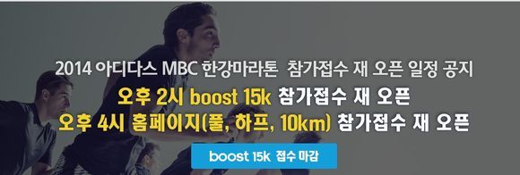 '2014 아디다스 MBC 한강 마라톤 대회'에 대한 관심이 뜨겁다. 이에 Boost 1500k 참가 접수는 재접수 시작 한 시간이 안되서 마감됐다.