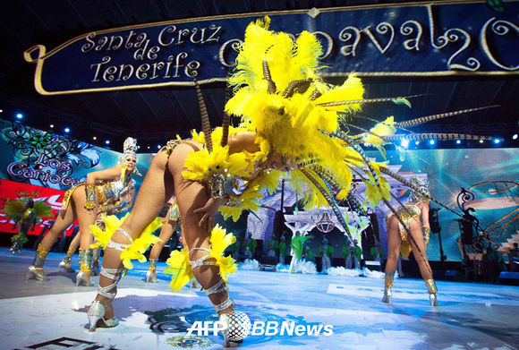 22일(이하 현지시간) 스페인 카나리 제도의 테네리페에서 열린 '산타 크루즈 드 테네리페' 카니발에서 한 댄서가 공연하고 있다.
