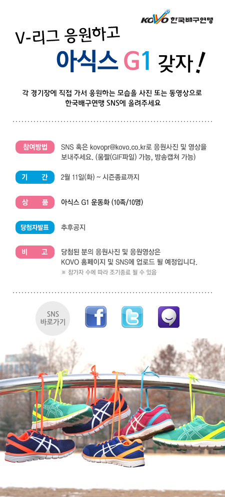 한국배구연맹(이하 KOVO, 총재 구자준)은 프로배구가 펼쳐지는 경기장에서 응원하는 모습의 사진 또는 동영상을 올리는 팬들 중 추첨을 통해 ‘아식스 G1’(1인 1족, 총 10족)을 경품으로 제공하는 이벤트를 실시한다.