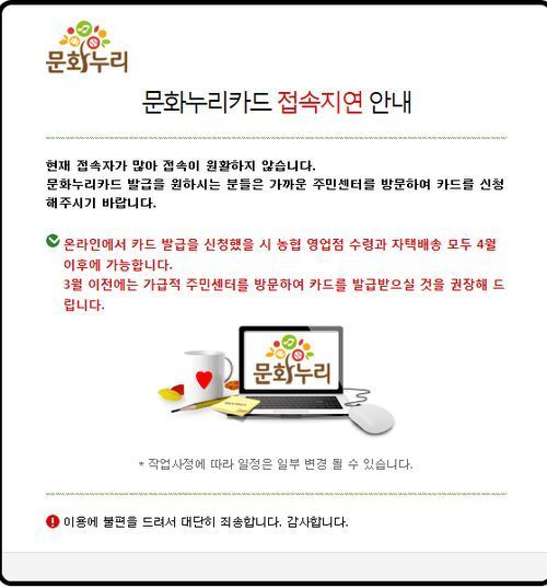 또한 문화누리카드는 홈페이지를 통해 온라인 시스템을 점검하고 있으며, 온라인 접수시 4월에나 카드를 수령할 수 있다고 알렸다.