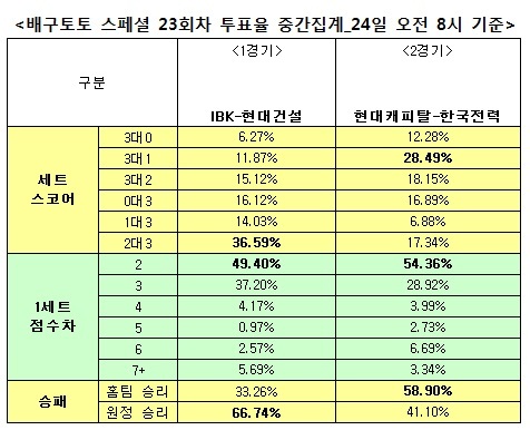 [배구토토] 국민체육진흥공단(www.kspo.or.kr)이 발행하는 체육진흥투표권 수탁사업자인 스포츠토토 공식 온라인 발매사이트 베트맨(www.betman.co.kr)이 오는 25일 열리는 2013-14시즌 국내프로배구(V리그)를 대상으로 한 배구토토 스페셜 23회차 투표율 중간집계 결과, 국내 배구팬 58.90%는 현대캐피탈-한국전력(2경기)전에서 현대캐피탈의 우세를 전망했다고 밝혔다.