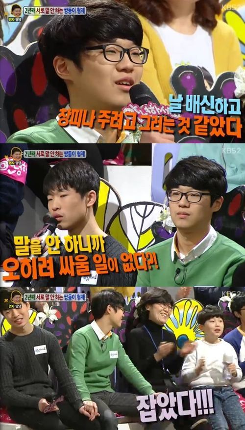 형은 "예전에는 내가 유치했던 것 같은데, 이제 자존심 싸움인 것 같다"고 말했고 동생은 MC들의 중재 노력에 "형이 왜 그랬는지 이해는 된다"고 말해 화해의 물꼬를 텄다. 이들은 결국 손을 잡으며 화해해 큰 박수를 받았다. 화해를 지켜본 쌍둥이의 엄마는 결국 눈물을 쏟았다.