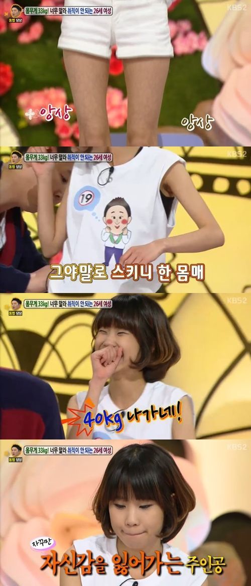 24일 방송된 KBS 2TV 예능프로그램 '대국민 토크쇼 안녕하세요'(이하 '안녕하세요')에서는 키 158cm에 몸무게가 33kg인 26세 고민녀가 등장했다.