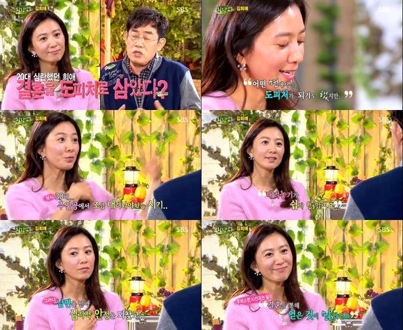 김희애는 24일 오후 방송된 SBS 예능프로그램 '힐링캠프-기쁘지 아니한가(이하 '힐링')'에서 "결혼 당시 남편을 만나 심리적 안정을 얻었다"고 말했다.
