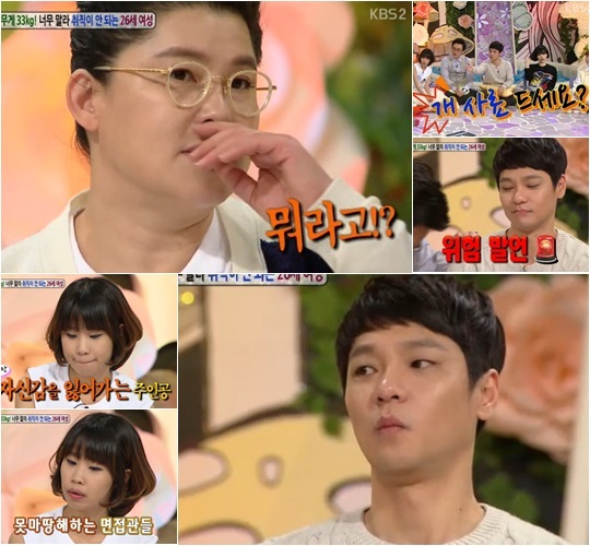 고민녀는 살이 찌기 위해 개사료를 먹어봤다고 말했다. 고민녀는 개사료를 먹으면 살이 찐다는 소문을 들었기 때문. 고민녀는 마른 자신의 몸 때문에 모르는 남자에게는 "때리면 부러질 것 같다. 때려볼까"라는 말을 듣거나, "뼈다귀"라는 놀림을 수도 없이 받아 자신감이 떨어졌다고 말했다.