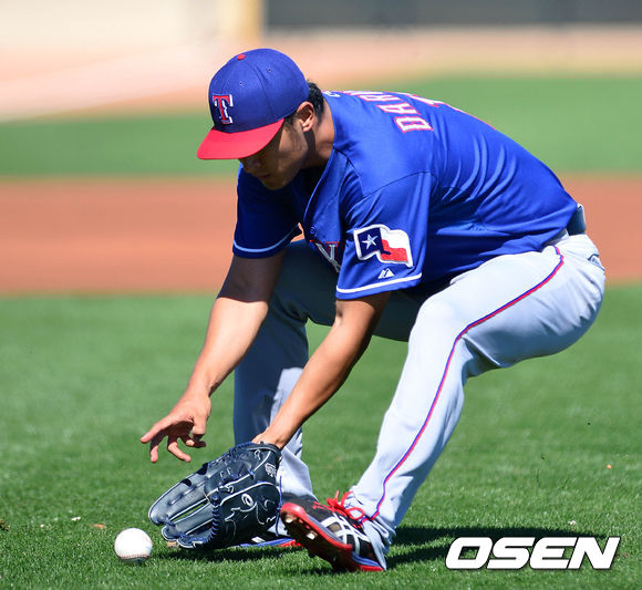 텍사스 다르빗슈 유가 땅볼 타구를 처리하고 있다.