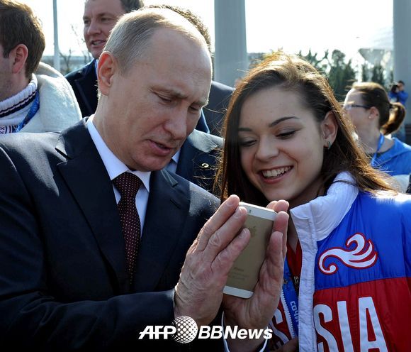 푸틴 대통령이 피겨스케이팅 여자 싱글 금메달리스트 아델리나 소트니코바(18)와 함께 휴대폰으로 셀카 찍기에 도전하고 있다.