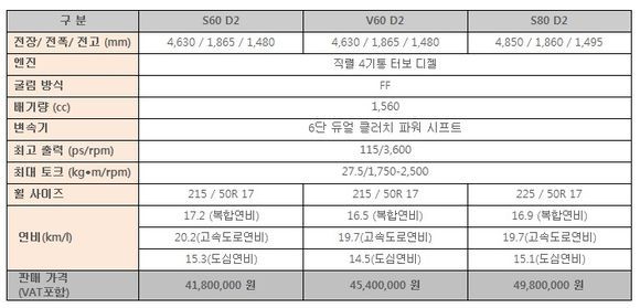 차량가격은 S60 D2가 4180만 원, V60 D2가 4540만 원, S80 D2가 4980만 원이다.(VAT 포함)