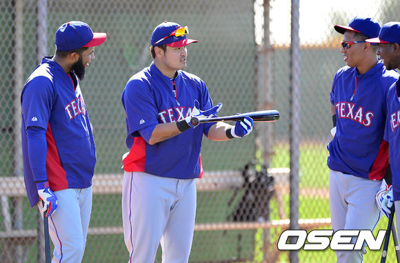 텍사스 추신수가 동료들과 이야기를 나누고 있다.