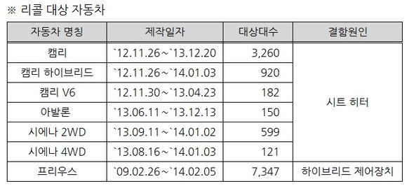 결함이 확인된 차량은 2012년 11월 26일부터 2014년 1월 3일 사이에 토요타 미국공장에서 제작돼 판매된 토요타 '캠리' '캠리 하이브리드' '캠리 V6' '아발론' '시에나 2WD' 및 '시에나 4WD' 등 6차종 5232대이다.