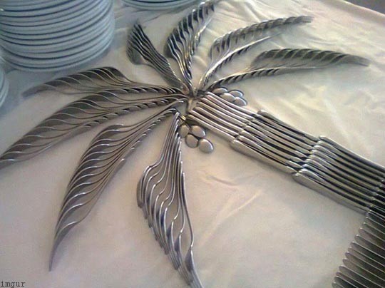 사진에는 크기가 다른 포크와 나이프, 티스푼을 이용해 만든 야자수 형상이 담겨있다.