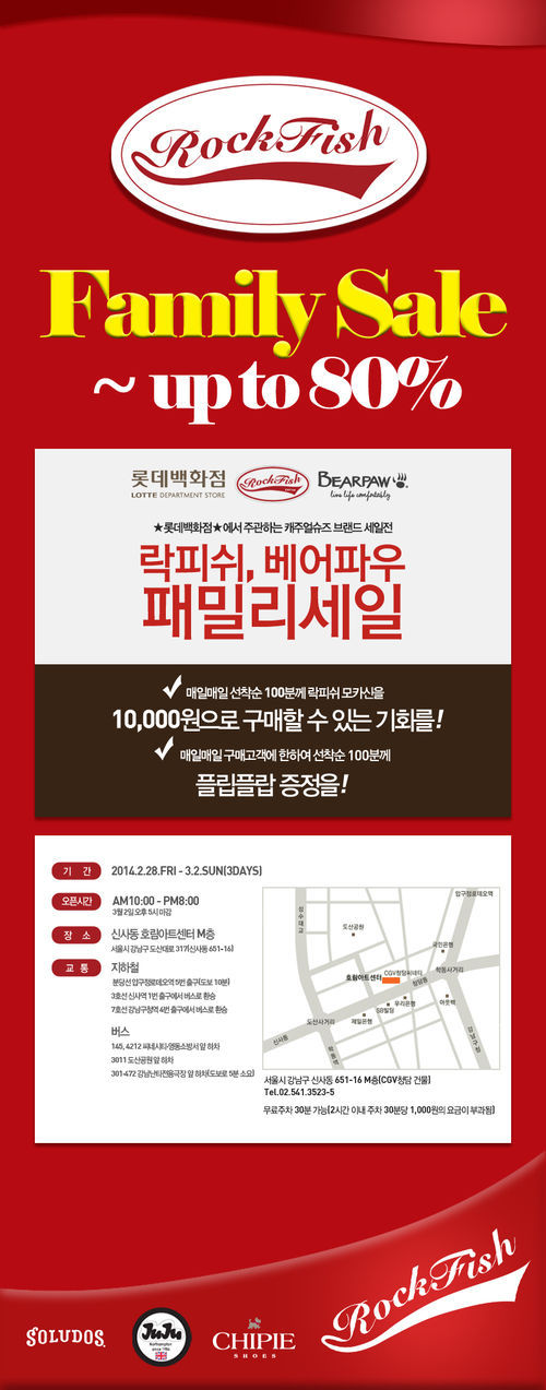 락피쉬, 솔루도스, 주주, 쉬피 등 해외 유명 슈즈 브랜드를 판매하는 슈즈 멀티샵에서 오는 3월 입학시즌을 맞아 온, 오프라인 패밀리세일을 진행한다.