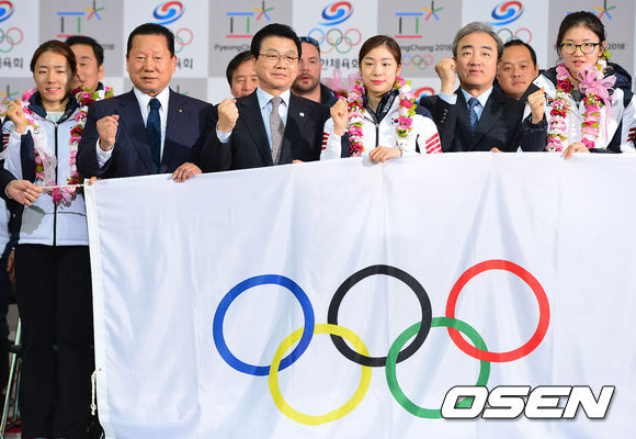 이상화, 김연아, 심석희, 김진선 평창동계올림픽 조직위원장, 유진룡 문화체육관광부 장관, 김정행 대한체육회장이 올림픽 대회기를 들고 파이팅을 외치고 있다.
