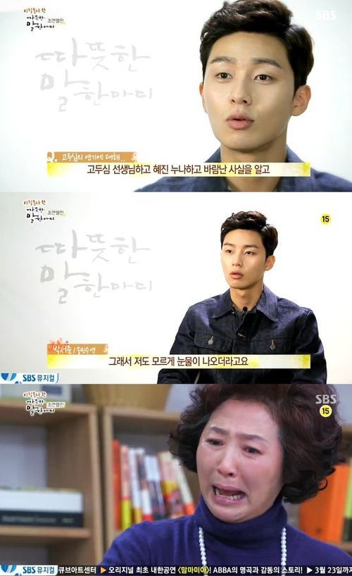 박서준은 25일 오후 방송된 SBS '아직 못다한 따뜻한 말 한마디'에서 극 중 나라(고두심 분)가 은진(한혜진 분), 재학(지진희 분)이 바람난 사실을 알게 된 장면에 대해 이야기하며 "저도 모르게 눈물이 났다"고 말했다.