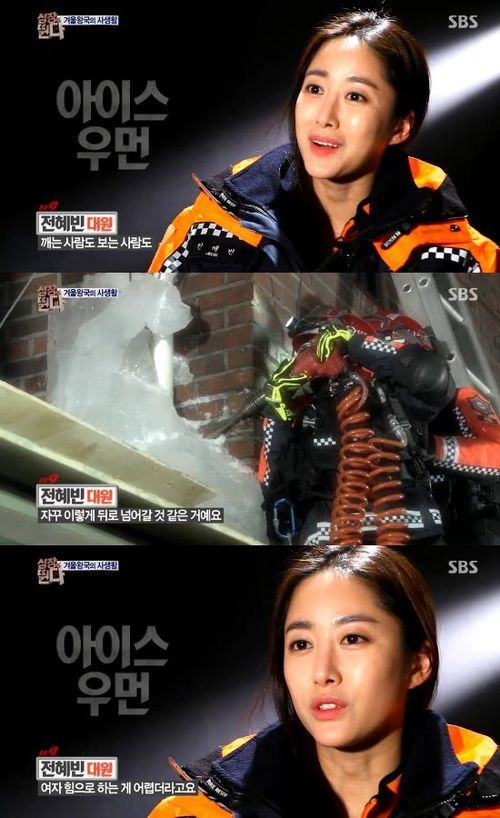 전혜빈은 25일 오후 방송된 SBS 예능프로그램 '심장이 뛴다'에서 강추위로 인해 생긴 고드름을 제거하기 위해 나섰다.