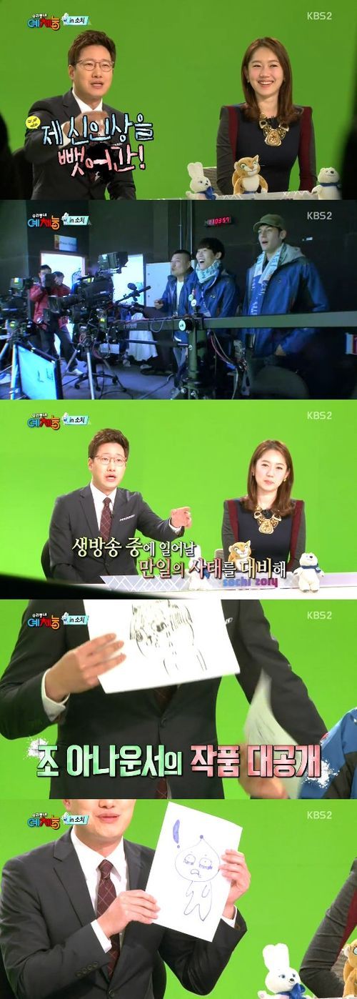 2분의 오프닝 멘트 후에도 만일의 사태를 대비, 24시간 대기상태인 조우종 아나운서. 그는 “엉덩이에 욕창이 생겼다. 10시간을 앉아 있어야 하니 엉덩이가 아프다”라며 무료함에 그린 그림을 공개해 웃음을 자아냈다.