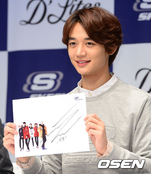 26일 오전 서울 서대문구 현대백화점 신촌점 제이드 홀에서 열린 스케쳐스 딜라이트 익스트림의 2014 S/S시즌 뉴 컬렉션 출시를 기념 샤이니 팬 사인회에서 그룹 샤이니(온유, 종현, 키, 민호, 태민)의 민호가 사인을 들어보이고 있다.