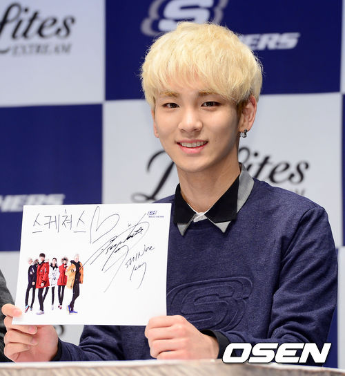 26일 오전 서울 서대문구 현대백화점 신촌점 제이드 홀에서 열린 스케쳐스 딜라이트 익스트림의 2014 S/S시즌 뉴 컬렉션 출시를 기념 샤이니 팬 사인회에서 그룹 샤이니(온유, 종현, 키, 민호, 태민)의 키가 사인을 들어보이며 포즈를 취하고 있다.