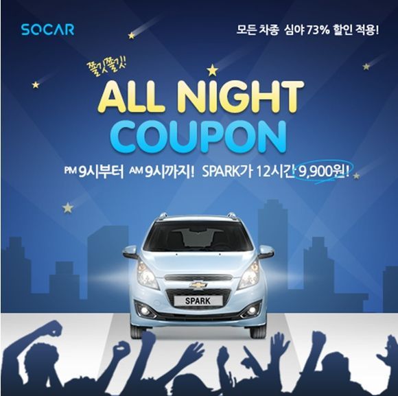 서울시 나눔카 공식사업자인 '쏘카'가 저녁 9시부터 아침 9시까지 심야 시간대 이용자를 위한 할인 혜택을 제공한다고 밝혔다.