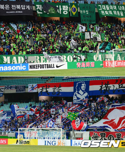 26일 오후 전주월드컵경기장에서 열린 '2014 아시아축구연맹(AFC) 챔피언스리그 조별리그 1차전' 전북 현대와 요코하마 F.마리노스의 경기 시작전 전북(위)응원단과 요코하마(아래) 응원단이 응원 경쟁을 펼치고 있다.