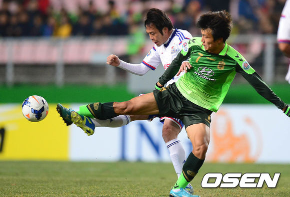26일 오후 전주월드컵경기장에서 열린 '2014 아시아축구연맹(AFC) 챔피언스리그 조별리그 1차전' 전북 현대와 요코하마 F.마리노스의 경기 전반 한교원이 요코하마 수비와 볼다툼을 벌이고 있다.