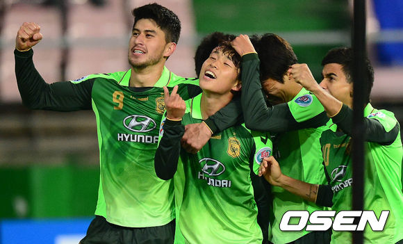 26일 오후 전주월드컵경기장에서 열린 '2014 아시아축구연맹(AFC) 챔피언스리그 조별리그 1차전' 전북 현대와 요코하마 F.마리노스의 경기 후반 이승기가 골을 넣고 동료들과 기뻐하고 있다.
