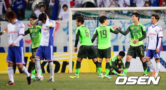 26일 오후 전주월드컵경기장에서 열린 '2014 아시아축구연맹(AFC) 챔피언스리그 조별리그 1차전' 전북 현대와 요코하마 F.마리노스의 경기 종료 후 전북 선수들이 승리를 기뻐하고 있다.