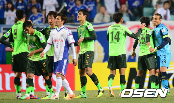 26일 오후 전주월드컵경기장에서 열린 '2014 아시아축구연맹(AFC) 챔피언스리그 조별리그 1차전' 전북 현대와 요코하마 F.마리노스의 경기 종료 후 전북 선수들이 서로를 격려하고 있다.