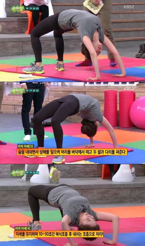이날 MC 박은영 아나운서는 허리 디스크에 좋은 아치 자세 시범을 보였다. 그는 몸을 완벽하게 아치로 만들어 모든 패널을 화들짝 놀라게 만들었다.