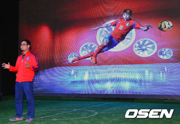 27일 오전 서울 광화문광장 특설무대에서 열린 나이키 2014 브라질월드컵 축구 국가대표 홈 유니폼 공개행사, 축구국가대표팀 유니폼이 공개되고 있다.