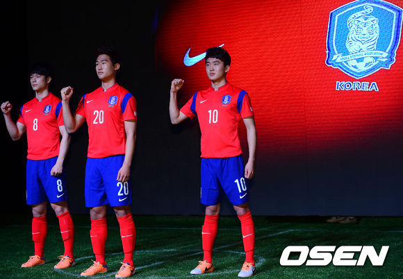 2014년 대한민국 축구대표팀의 홈 유니폼은 전통적으로 계승해 온 강렬한 붉은색 상의와 짙은 파란색 하의로 디자인되어, 음과 양이 조화된 태극문양을 역동적으로 표현했다. 특히, 상의 양 어깨 이음선에는 파란색의 디자인 하이라이트가 가미되어, 갑옷을 입은 전사와 같은 강인함을 표현하였다.