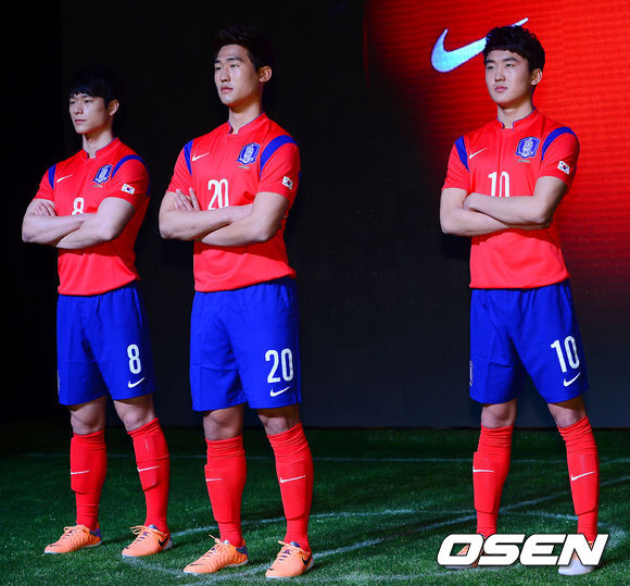 2014년 대한민국 축구대표팀의 홈 유니폼은 전통적으로 계승해 온 강렬한 붉은색 상의와 짙은 파란색 하의로 디자인되어, 음과 양이 조화된 태극문양을 역동적으로 표현했다. 특히, 상의 양 어깨 이음선에는 파란색의 디자인 하이라이트가 가미되어, 갑옷을 입은 전사와 같은 강인함을 표현하였다.