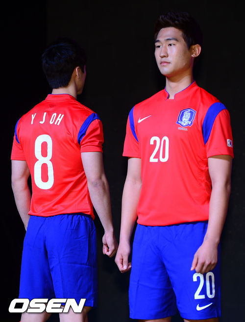 2014년 대한민국 축구대표팀의 홈 유니폼은 전통적으로 계승해 온 강렬한 붉은색 상의와 짙은 파란색 하의로 디자인되어, 음과 양이 조화된 태극문양을 역동적으로 표현했다. 특히, 상의 양 어깨 이음선에는 파란색의 디자인 하이라이트가 가미되어, 갑옷을 입은 전사와 같은 강인함을 표현하였다.