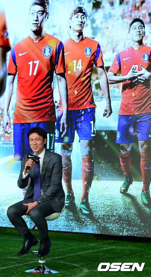 27일 오전 서울 광화문광장 특설무대에서 열린 나이키 2014 브라질월드컵 축구 국가대표 홈 유니폼 공개행사, 홍명보 감독이 질문에 답하며 미소짓고 있다.