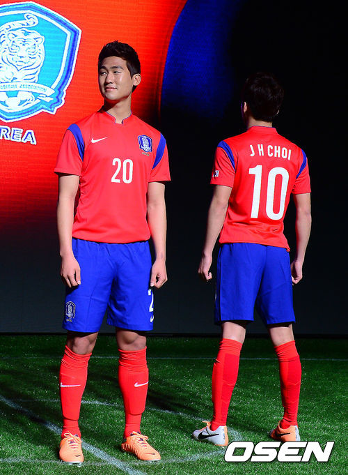2014년 대한민국 축구대표팀의 홈 유니폼은 전통적으로 계승해 온 강렬한 붉은색 상의와 짙은 파란색 하의로 디자인되어, 음과 양이 조화된 태극문양을 역동적으로 표현했다. 특히, 상의 양 어깨 이음선에는 파란색의 디자인 하이라이트가 가미되어, 갑옷을 입은 전사와 같은 강인함을 표현하였다.